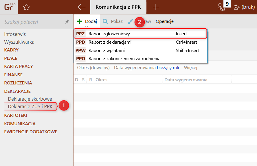 1. Przejść do modułu Deklaracje  Deklaracje ZUS i PPK na zakładkę Komunikacja z PPK, a następnie w górnym menu wybrać Dodaj  Raport zgłoszeniowy.
