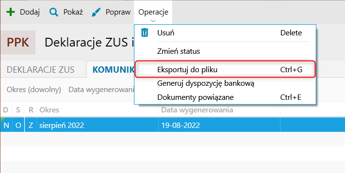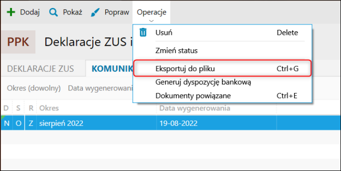 4. Z górnego menu wybrać Operacje ​ Eksportuj do pliku. Spowoduje to wygenerowanie pliku do zapisania na komputerze.