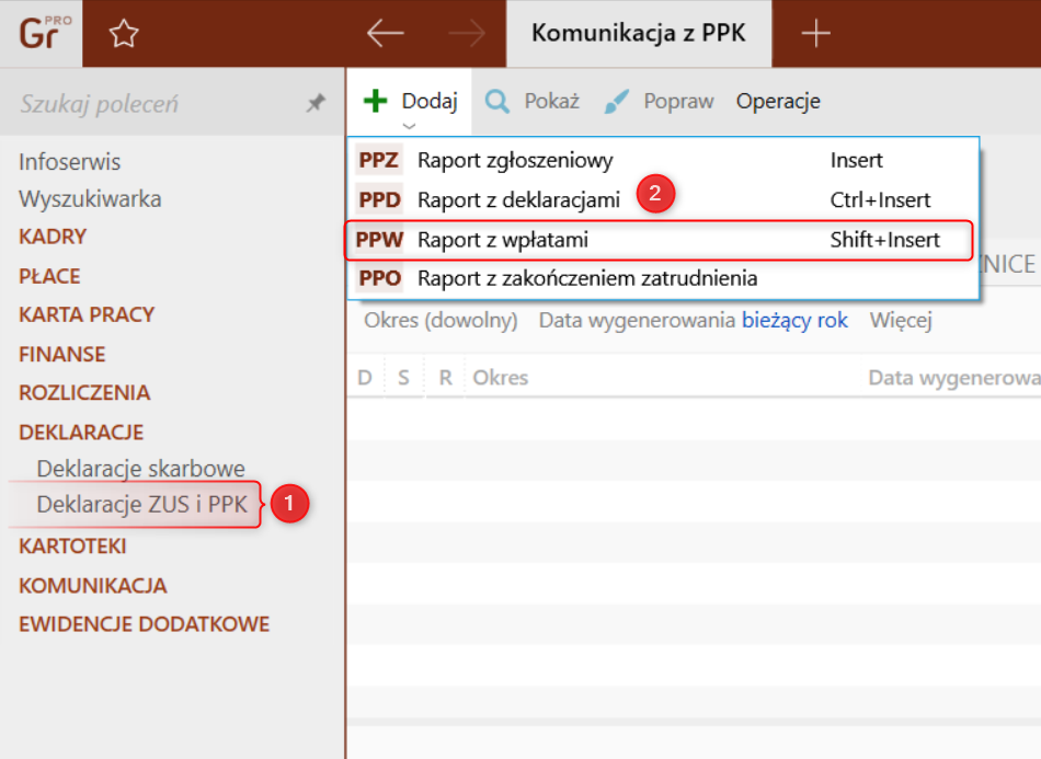 1. Przejść do modułu Deklaracje – Deklaracje ZUS i PPK na zakładkę Komunikacja z PPK, a następnie w górnym menu wybrać Dodaj – Raport z wpłatami.
