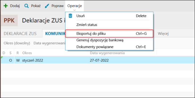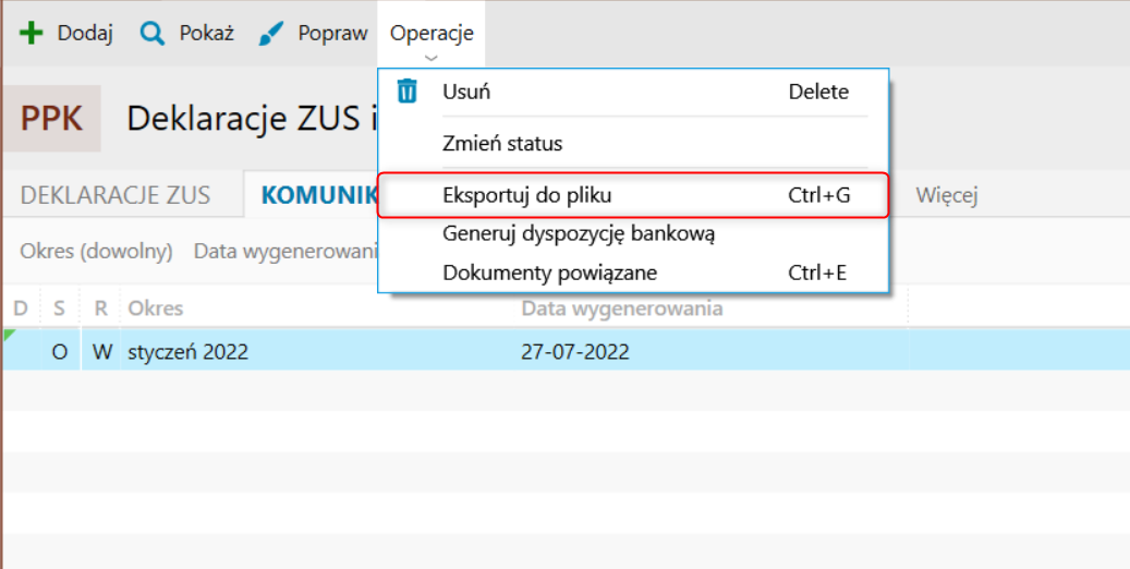 4. Z górnego menu wybrać Operacje – Eksportuj do pliku. Spowoduje to wygenerowanie pliku do zapisania na komputerze. W menu Operacje znajduje się również opcja generowania dyspozycji bankowych do wskazanej instytucji finansowej.