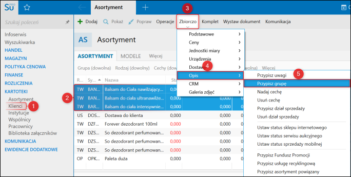 1. Z listy modułów wybrać Kartoteki – Asortyment, zaznaczyć kartoteki, których grupa zostanie zmieniona i z górnego menu wybrać Zbiorczo – Opis – Przypisz grupę.