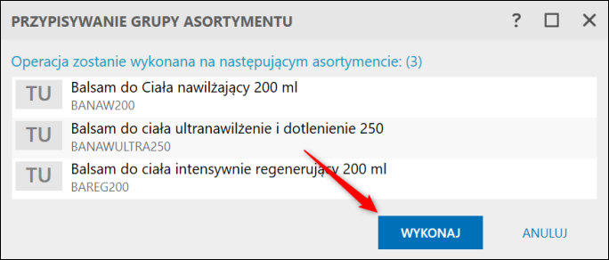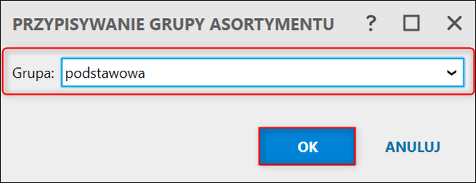2. W oknie, które się wyświetli wybrać grupę, jaka ma zostać przypisana do zaznaczonego wcześniej asortymentu. Wybór zatwierdzić przyciskiem OK.