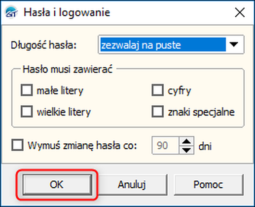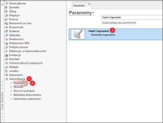 1. Przejść do modułu Administracja — Parametry, odnaleźć na liście Hasła i logowanie.
