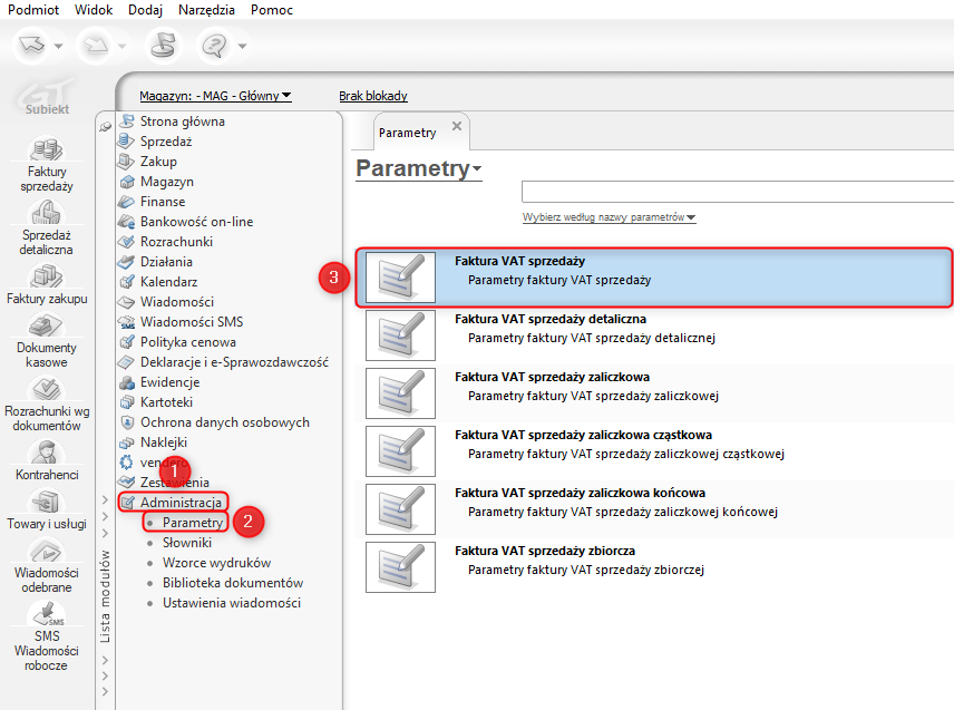 1. Z listy modułów wybrać AdministracjaParametry, a z listy parametrów konkretny typ dokumentu przy wystawianiu, którego wyszukiwane towary mają być posortowane alfabetycznie.