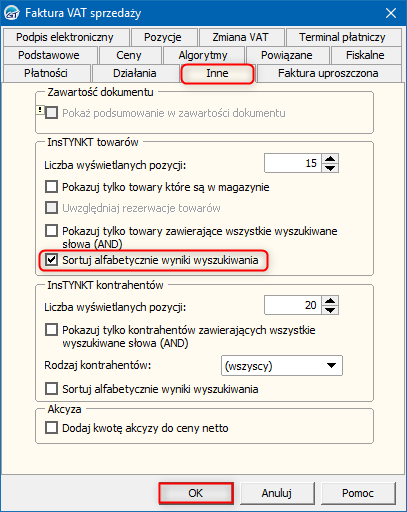 2. Na zakładce Inne, w sekcji InsTYNKT towarów zaznaczyć opcję Sortuj alfabetycznie wyniki wyszukiwania. Zmiany zapisać przyciskiem OK.