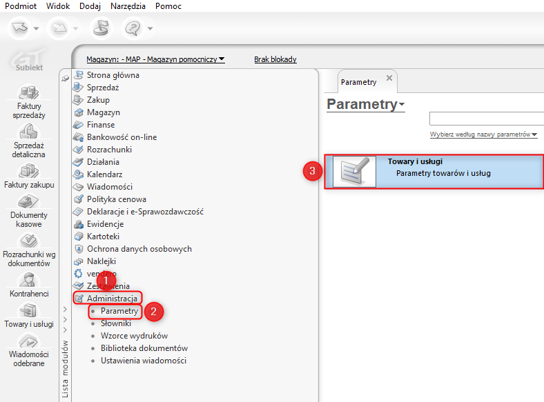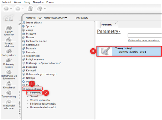1. Z listy modułów wybrać Administracja – Parametry, a z listy parametrów Towary i usługi.