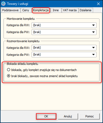 2. Na zakładce Kompletacja wybrać w sekcji Blokada składu kompletu jedną z dwóch opcji. Zmiany zapisać przyciskiem OK.