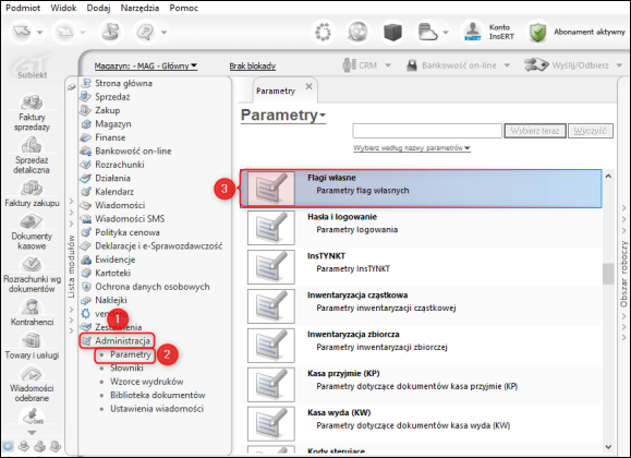 1. Z listy modułów wybrać Administracja – Parametry, a z listy parametrów – Flagi własne.