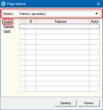 2. W oknie Flagi własne wybrać obiekt, do którego ma zostać stworzona flaga i wybrać opcję Dodaj.