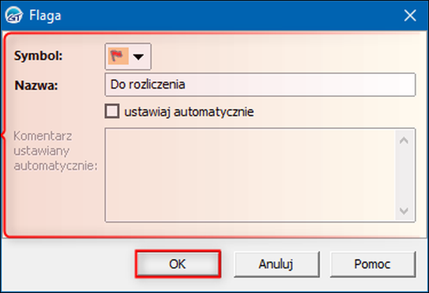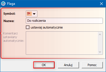 3. W oknie Flaga wybrać symbol oraz nazwę flagi. Opcjonalnie można wprowadzić domyślny komentarz. Flagę zapisać przyciskiem OK.