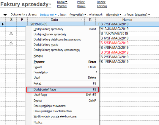 5. Po skonfigurowaniu flag można je nadawać do konkretnych obiektów. W tym celu należy przejść do modułu, gdzie znajdują się obiekty, do których zostały przypisane flagi, kliknąć konkretny obiekt prawym przyciskiem myszy i wybrać opcję Dodaj/zmień flagę.