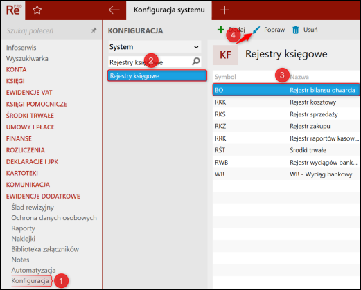1. Przejść do modułu Ewidencje dodatkowe ​ Konfiguracja ​ Rejestry księgowe, a następnie edytować wybrany rejestr.