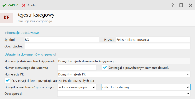 2. W sekcji Ustawienia dokumentów księgowych edytować Domyślną walutowość grupy pozycji z Systemowej na Jednorodną w grupie i wskazać wybraną przez użytkownika walutę. Po wskazaniu waluty, ustawienia rejestru zapisać.