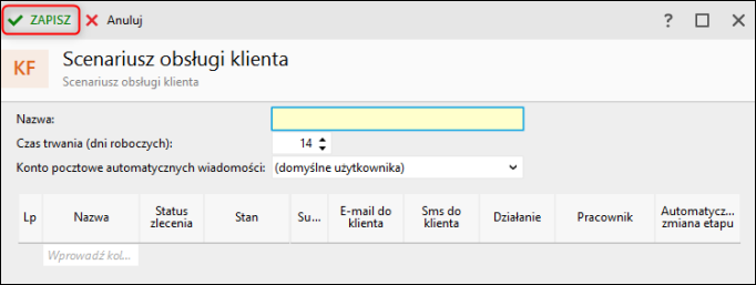 3. Uzupełnić pole Nazwa i tabelę scenariusza. Zmiany zatwierdzić przyciskiem Zapisz.