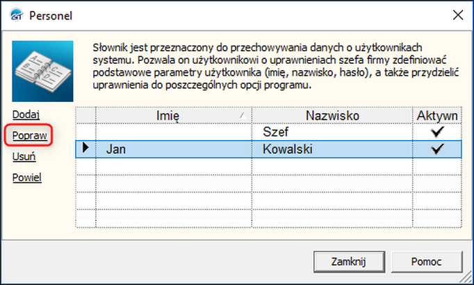 2. Zaznaczyć użytkownika, a następnie w celu edycji uprawnień wybrać Popraw.
