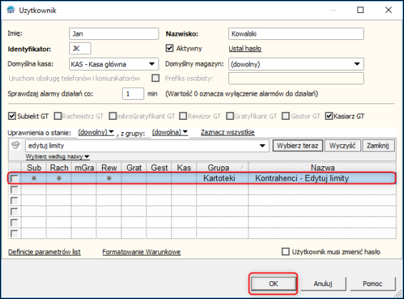 3. Odnaleźć na liście uprawnienie Kontrahenci – Edytuj limity i odznaczyć uprawnienie. Zmiany zatwierdzić przyciskiem OK.