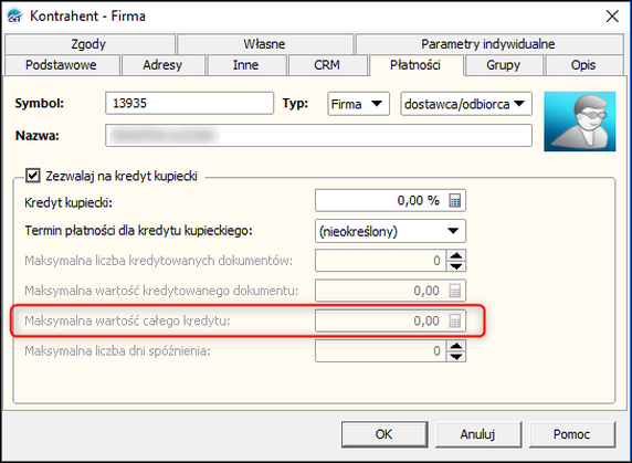 W rezultacie użytkownik mający zabrane uprawnienie, wchodząc do kartoteki kontrahenta, wybraną opcję będzie miał niedostępną do edycji.