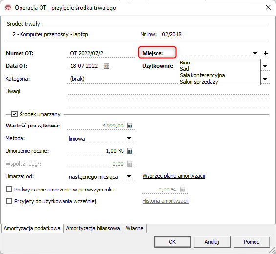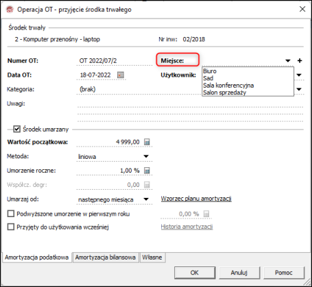 Po zapisaniu, miejsca te wskazuje się przy wystawianiu dokumentów OT na środki trwałe.