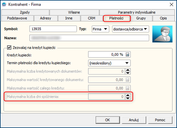 W rezultacie użytkownik mający zabrane uprawnienie, wchodząc do kartoteki kontrahenta, wybraną opcję będzie miał niedostępną do edycji.