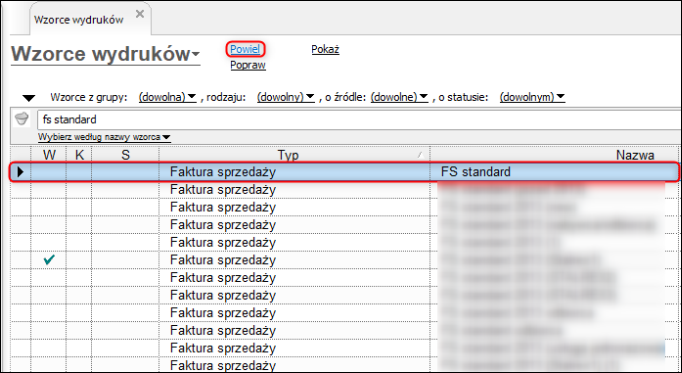2. Zaznaczyć wybrany wzorzec i kliknąć Powiel.
