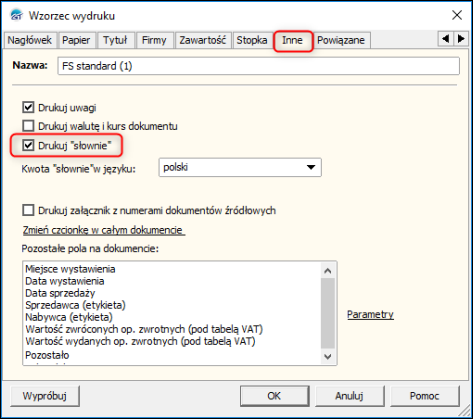 3. Przejść na zakładkę Inne i odznaczyć znacznik Drukuj "słownie". Zmiany zatwierdzić przyciskiem OK.