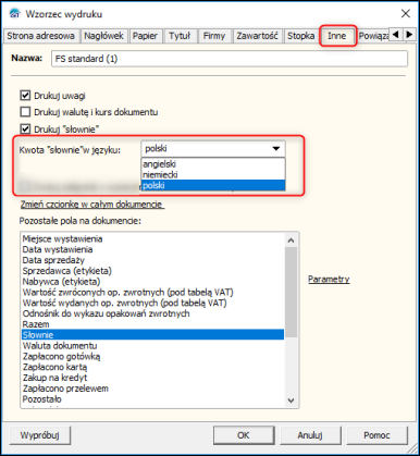 3. Przejść na zakładkę Inne w oknie edycji, a następnie rozwinąć listę Kwota "słownie" w języku. Zmiany zatwierdzić przyciskiem OK.