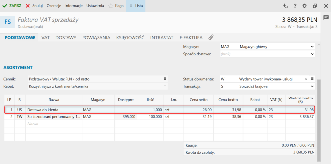 1. W formularzu dokumentu, w sekcji Asortyment kliknąć ikonę drabinki obok pozycji Usługi jednorazowej, a następnie wybrać opcję Zamień naNowy.