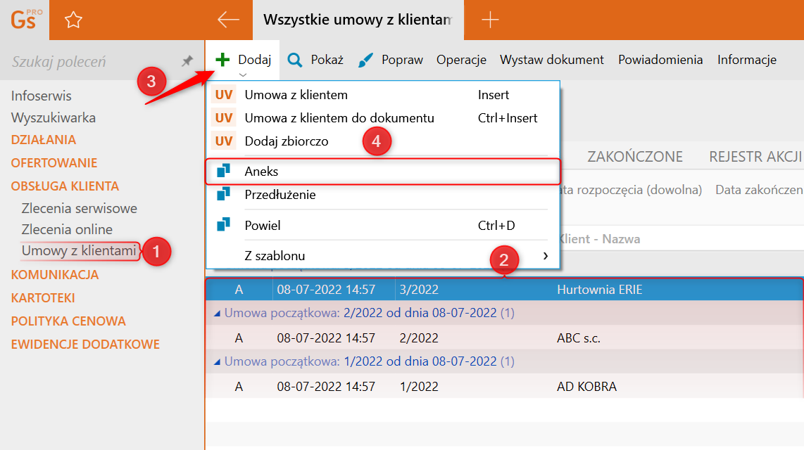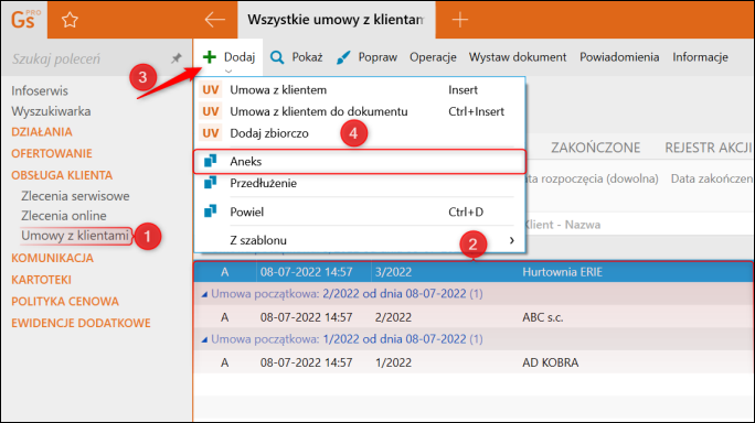 Aneks do umowy z klientem przenosi dane z umowy źródłowej takie jak cała zawartość zakładki Planowane (cykl fakturowania, planowane akcje, akcje automatyczne, itp.), Asortyment i Treść. Dodatkowo widok w module Umowy z klientami Gestor w przejrzysty sposób prezentuje oryginał umowy i aneksy/przedłużenia do niej w jednej grupie. Aby wystawić aneks do umowy, należy wykorzystać menu Dodaj po zaznaczeniu umowy i wybrać opcję Aneks. Wywoła to okno, w którym można wprowadzić nowe parametry (zupełnie jak w przypadku nowej umowy pomijając dane, które zostały przeniesione). Po zapisaniu aneksu oryginalna umowa zmieni swój status na Aneksowana, co uniemożliwi jej edycję, a wszystkie kolejne operacje należy wykonywać na obiekcie aneksu.