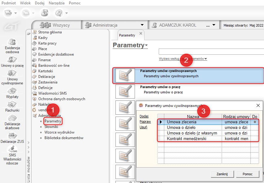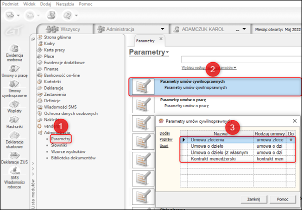 1. Przejść do modułu Administracja – Parametry – Parametry umów cywilnoprawnych i edytować kolejno każdy rodzaj umowy.