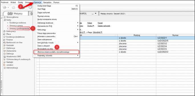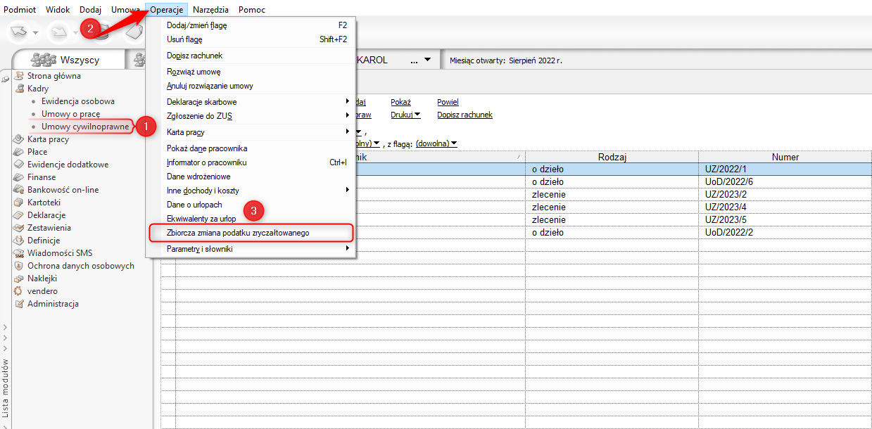 Dla istniejących umów cywilnoprawnych można przypisać zbiorczo nową stawkę podatku korzystając z opcji Zbiorcza zmiana podatku zryczałtowanego, która znajduje się w module Umowy cywilnoprawne.