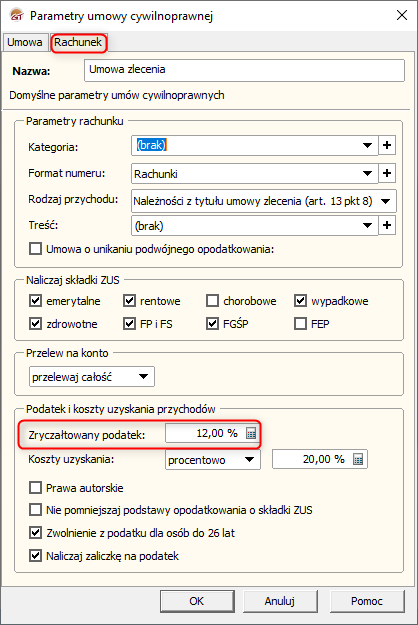 2. Na zakładce Rachunek w sekcji Zryczałtowany podatek zmienić wartość na 12% i zapisać OK.