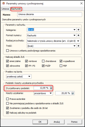 Po zapisaniu zmian każda nowo utworzona umowa będzie generowana ze zryczałtowanym podatkiem w stawce 12%.