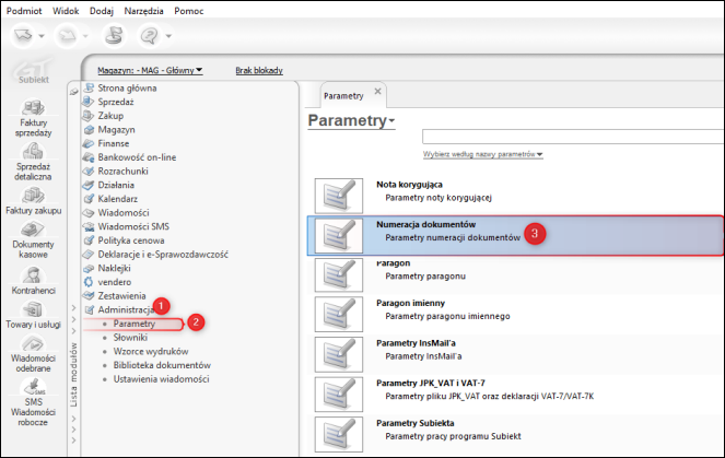 1. Przejść do modułu Administracja – Parametry – Numeracja dokumentów.