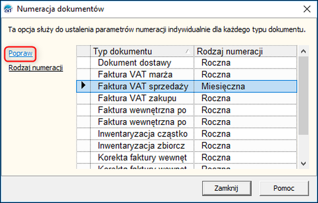 2. W oknie Numeracja dokumentów wybrać typ dokumentu, a następnie opcję Popraw.
