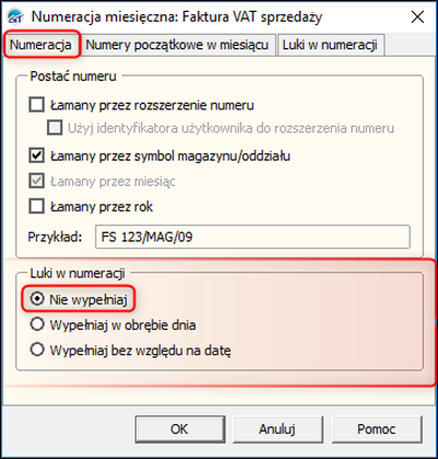 3. W zakładce Numeracja ​zaznaczyć w sekcji Luki w numeracji Nie wypełniaj.