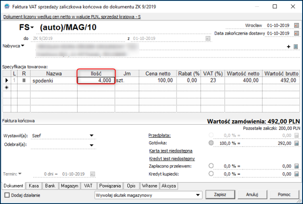 Automatycznie realizując zamówienie fakturą końcową
