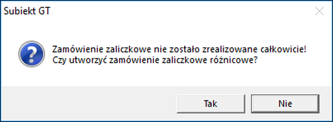 W przypadku wybrania opcji Tak program otworzy ponownie okno zamówienia od klienta w celu dodania zamówienia różnicowego.