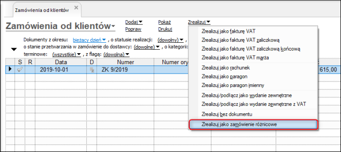 Zamówienie różnicowe jest traktowane jak zwykłe zamówienie wypisane ręcznie – można je edytować, usuwać oraz zrealizować jako nowy dokument handlowy, w tym realizować częściowo. Jedyną różnicą jest jego automatyczny charakter – powstaje i jest wyliczone ze wskazanego zamówienia źródłowego.