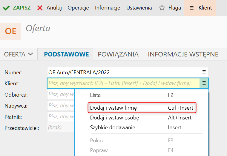 2. Jeżeli jest to pierwszy kontakt z klientem i nie posiada on własnej kartoteki, z poziomu oferty można ją utworzyć wybierając rozwijane menu w sekcji Klient – Dodaj i wstaw firmę.