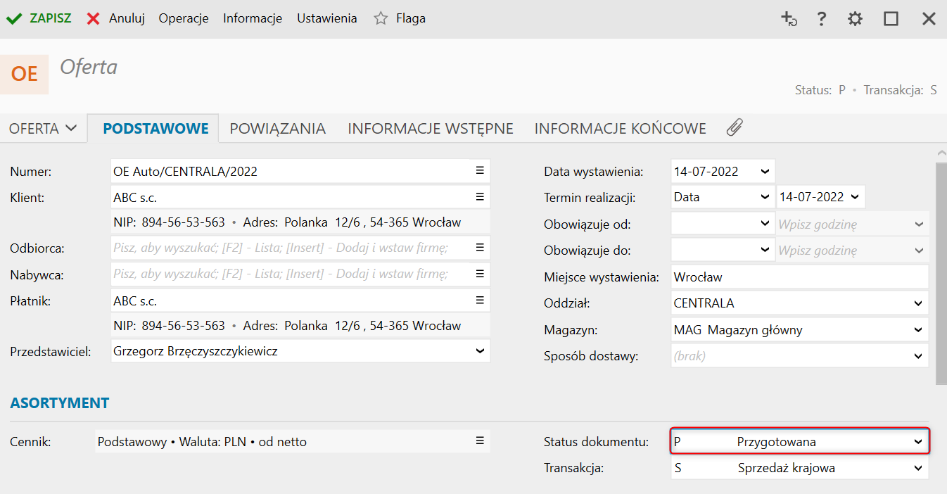 3. Kolejnym etapem jest wprowadzenie asortymentu będącego przedmiotem oferty. Po jego wprowadzeniu użytkownik zmienia status oferty na Przygotowana i zapisuje dokument.