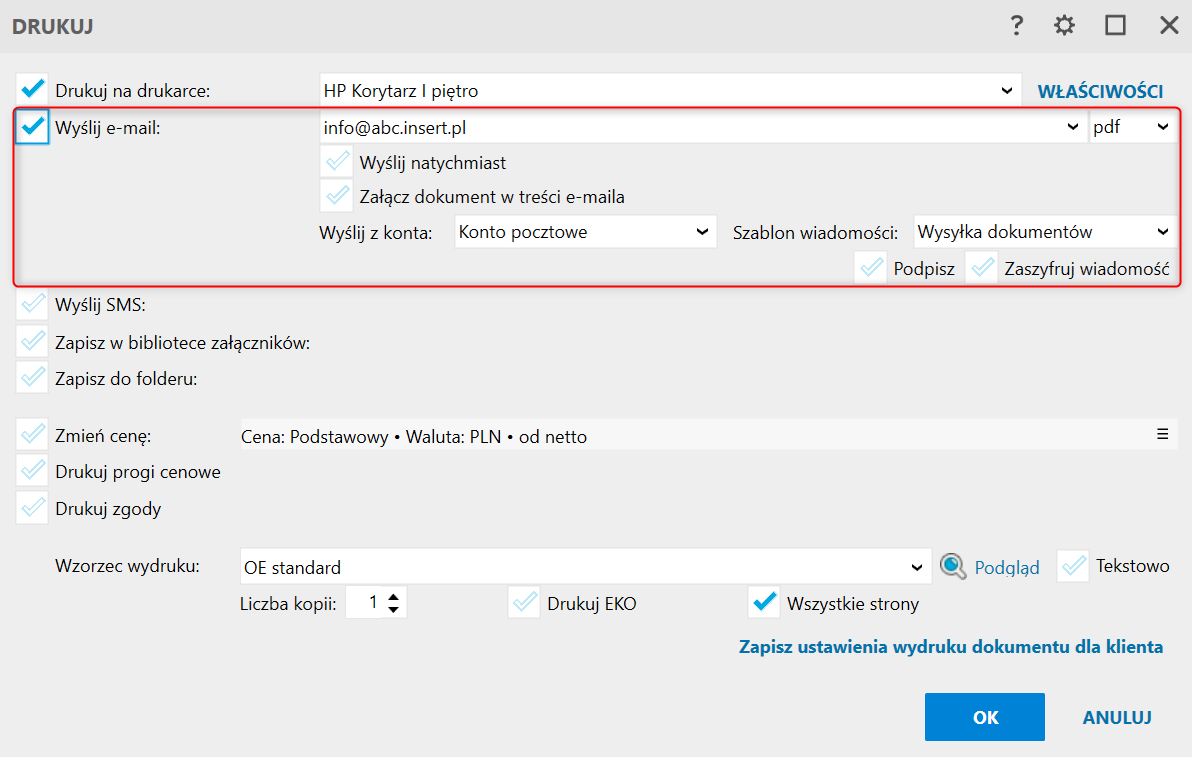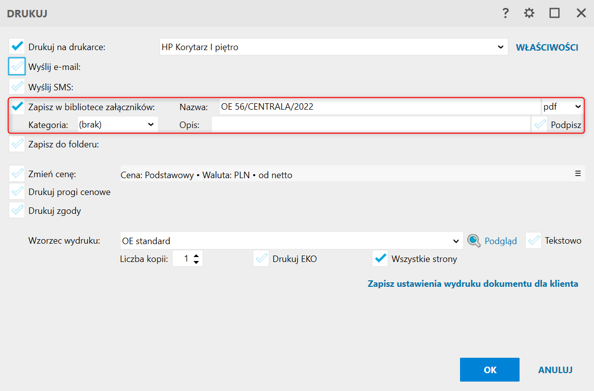 4. W oknie wydruku oferty użytkownik może wysłać wiadomość e-mail, załączając do niej dokument. W tym celu należy posiadać utworzony szablon wiadomości e-mail. Jeżeli użytkownik nie używa szablonów lub preferuje wysłać ofertę w odpowiedzi na wiadomość klienta, może zapisać dokument do biblioteki załączników, a następnie dodać go do odpowiedzi.