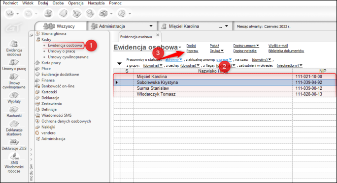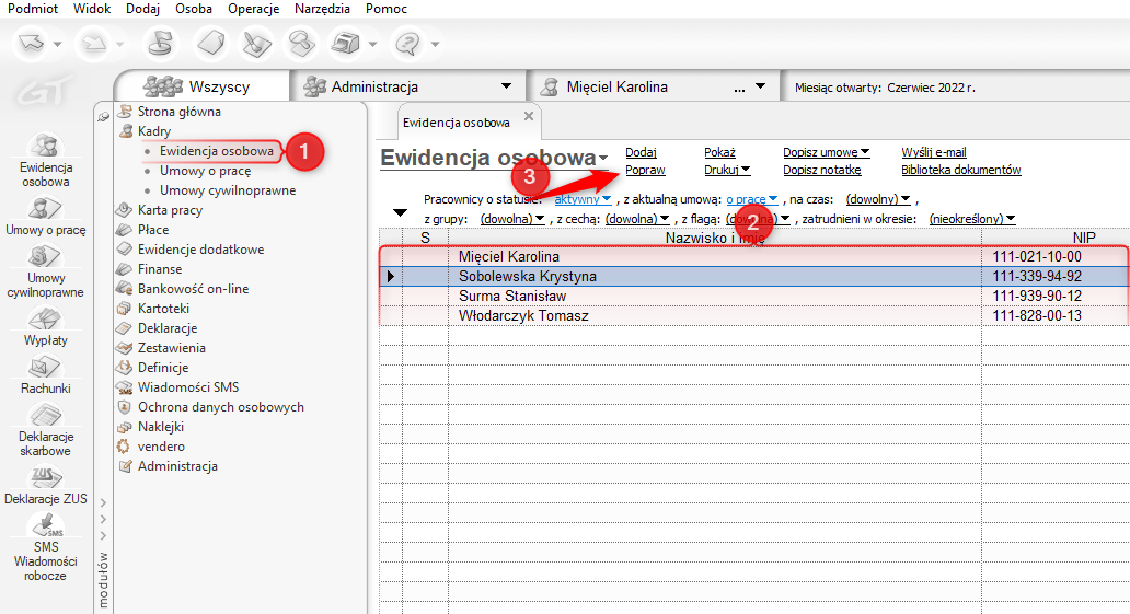 1. Przejść do modułu Kadry Ewidencja osobowa i Poprawić kartotekę pracown​ika.