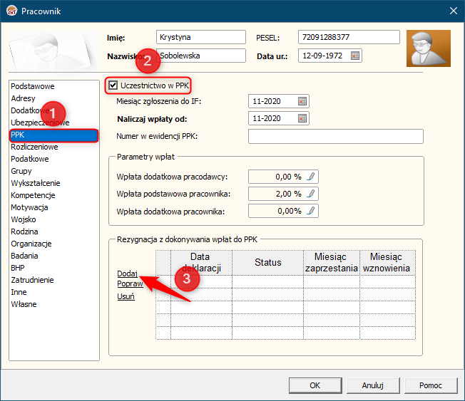 Jeżeli pracownik zdecyduje się zrezyg​nować z wpłat do PPK, fakt ten należy zewidencjonować w jego kartotece. Aby wprowadzić rezygnację, należy: