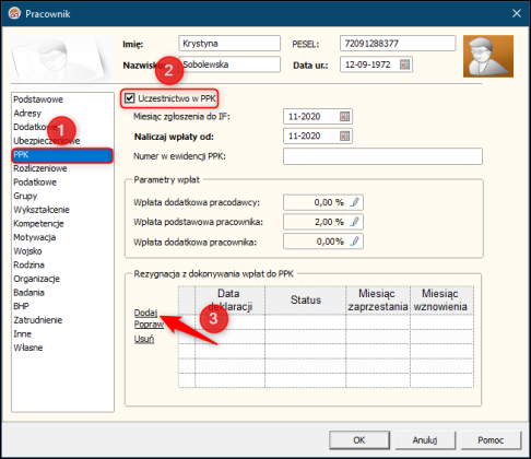 Gratyfikant GT – Jak wprowadzić rezygnację z dokonywania wpłat do PPK w kartotece pracownika?