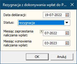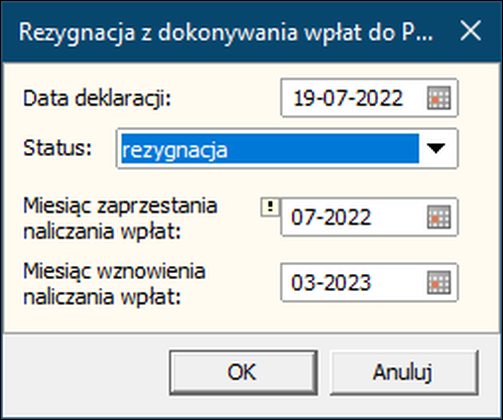 3. Wprowadzić datę deklaracji i miesiąc zaprzestania naliczania wpłat. Co więcej, jeżeli pracownik rezygnuje przed zgłoszeniem do PPK, należy parametr Status ustawić na rezygnacja przed zgłoszeniem. Po wprowadzeniu danych zapisać zmiany przyciskiem ​OK.