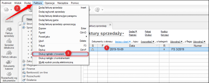 Zaznaczyć dokument handlowy na liście, a następnie z górnego menu Faktura wybrać Drukuj naklejki z towarami.