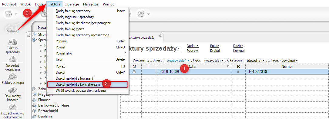 Zaznaczyć dokument handlowy na liście, a następnie z górnego menu Faktura wybrać Drukuj naklejki z kontrahentami.
