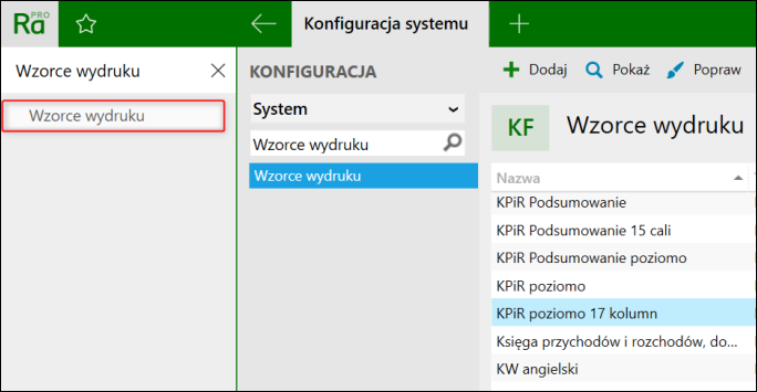 1. W wyszukiwarce wpisać Wzorce wydruku i przejść do listy wzorców wydruku.