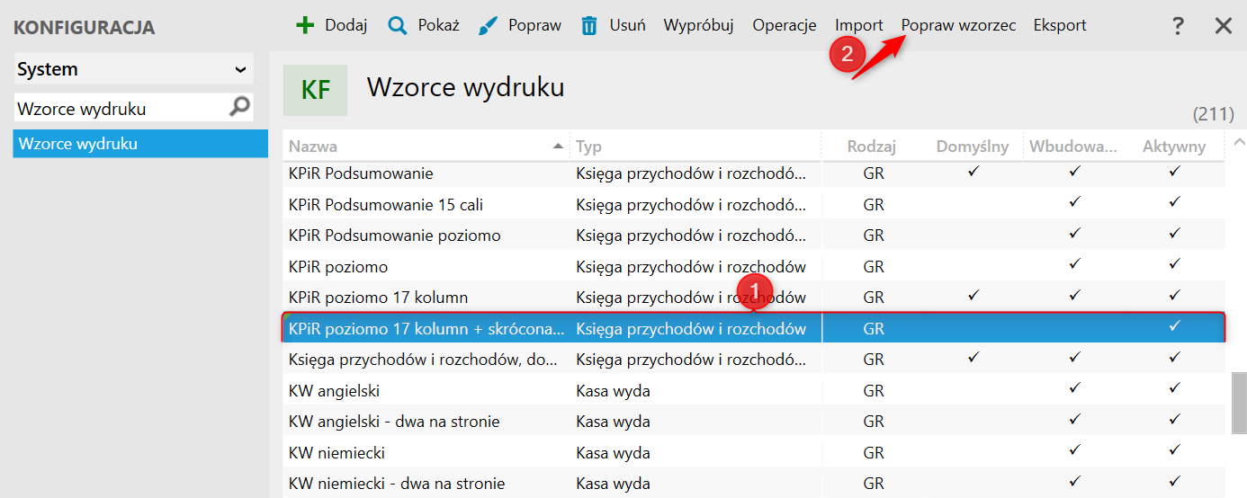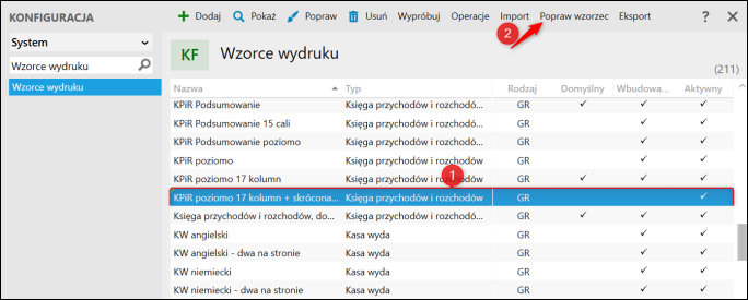 2. Odnaleźć odpowiedni wzorzec (w opisywanym przykładzie jest to KPiR poziomo 17 kolumn), następnie kliknąć górne menu Dodaj - Powiel.