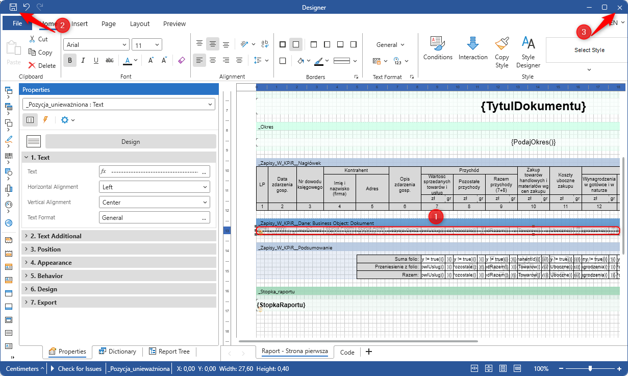 7. Pole z przerywaną linią przywrócić na miejsce sprzed modyfikacji. Zapisać wprowadzone zmiany i zamknąć program Stimulsoft.